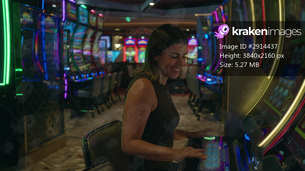 Woman playing a row of slot machines, hands on controls and smiling while pressing a button in a casino building; excitement luck chance.