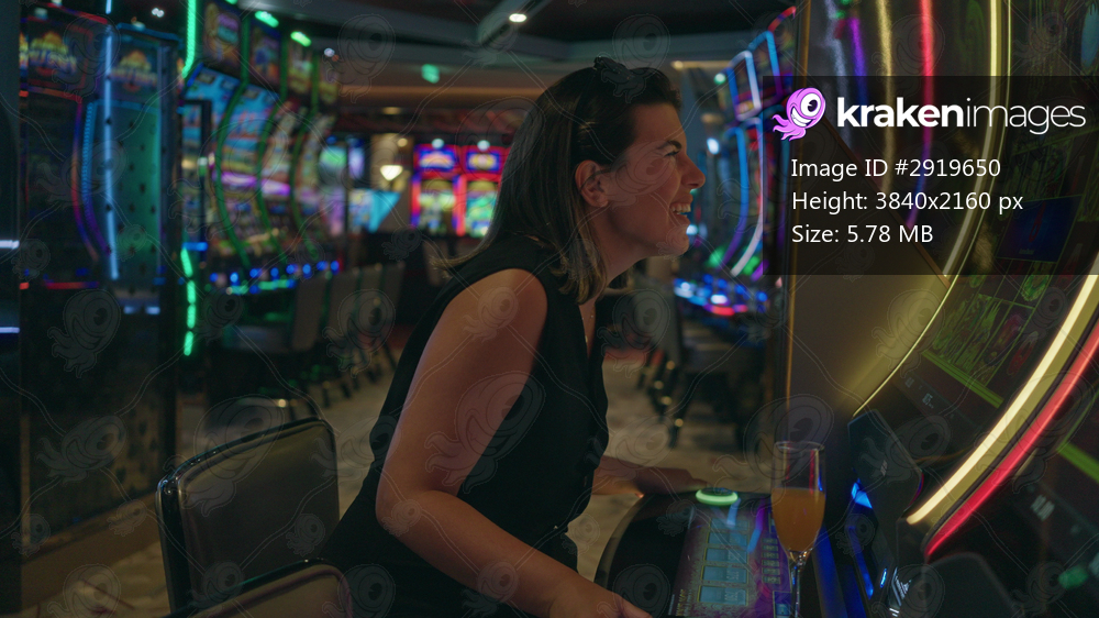 Woman playing a slot machine in a casino, hands on buttons and fist pump at neon gaming row; winning excitement.