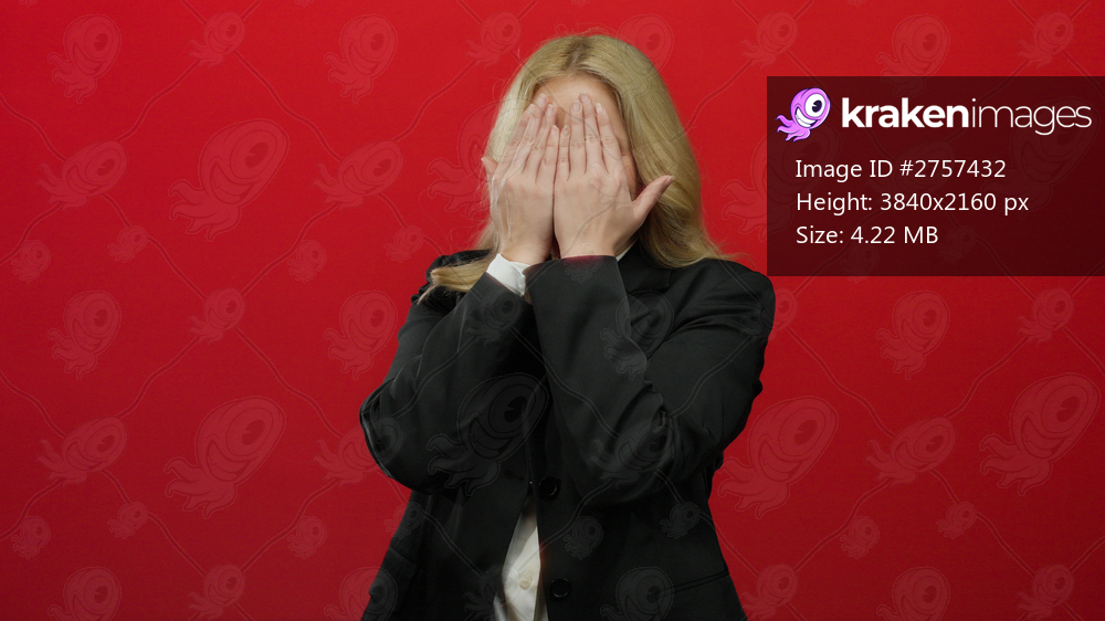 Woman playing peekaboo in front of a vibrant red background, blonde hair blending with a formal black suit, evoking playfulness and intrigue in an unexpected professional setting. - Kraken Images