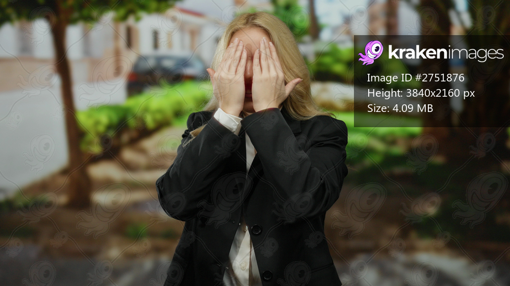 Woman playing peekaboo on a city street, smiling playfully with a backdrop of trees and buildings, showcasing youthful joy and urban environment.