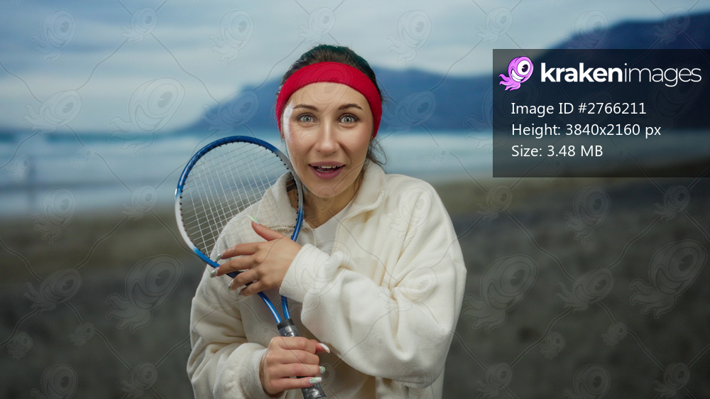 Woman playing tennis on a beach holding a racket with ocean and mountains in the background during a cloudy day in an outdoor seaside setting