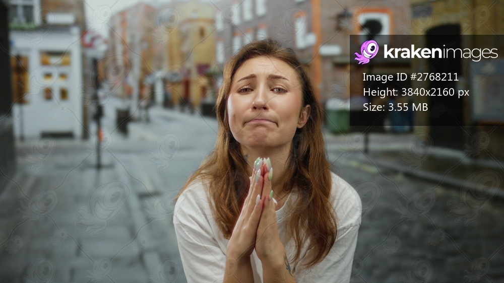 Woman pleading on a city street with a hopeful expression, captured outdoors in an urban setting, showcasing her emotion and the bustling city environment around her. - Kraken Images