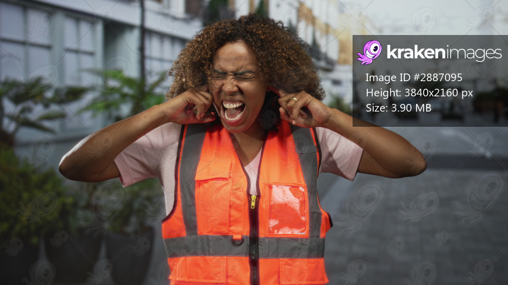 Woman plugging ears with fingers in bright orange safety vest on street shouting; city noise frustration.