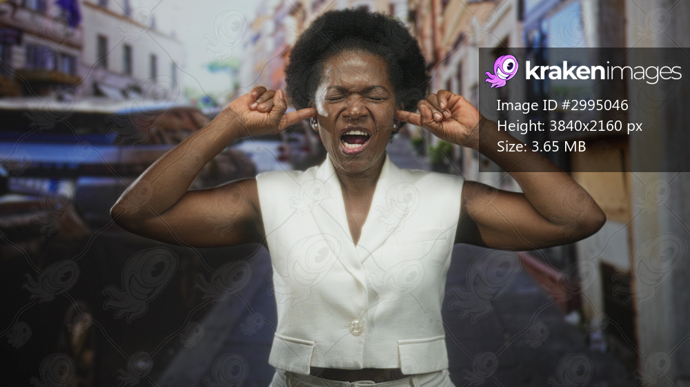 Woman plugging ears with fingers, mouth open on a street with parked cars and storefronts; frustration noise discomfort.