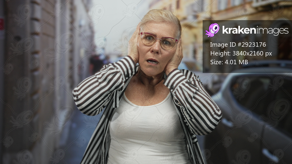 Woman plugging ears with fingers on city street, wearing glasses and striped shirt; urban frustration.