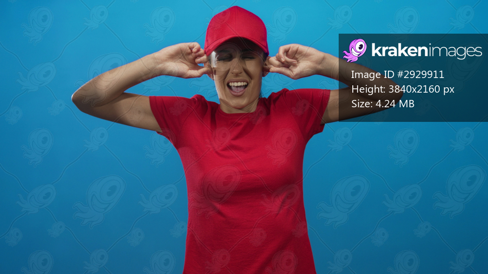 Woman plugging ears with fingers and squinting in blue studio wearing red cap and t shirt; irritation noise.