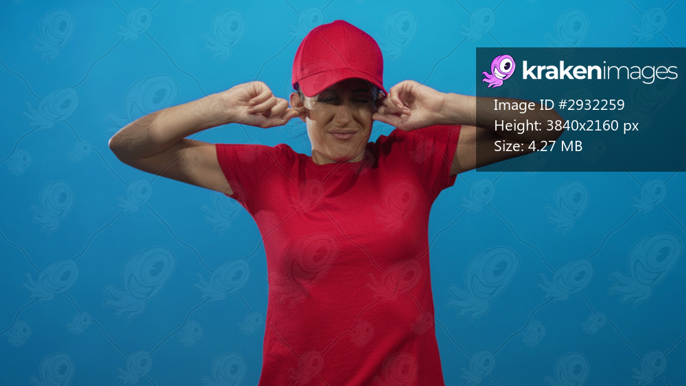 Woman plugging ears with fingers and squinting in blue studio wearing red cap and t shirt; irritation noise.