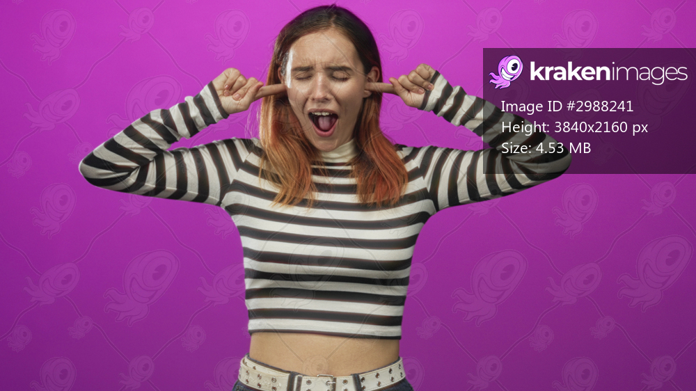 Woman plugs ears with fingers, eyes closed and mouth open, wearing striped crop top and studded belt against magenta studio backdrop; annoyance sensory overload. - Kraken Images