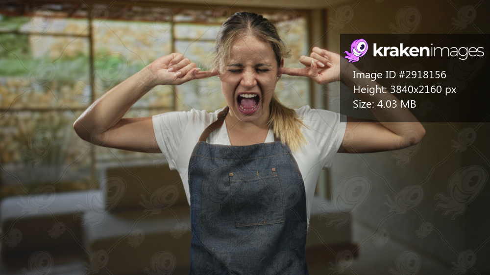 Woman plugs ears with fingers and screams in an empty studio room, wearing denim apron and ponytail; frustration overload.
