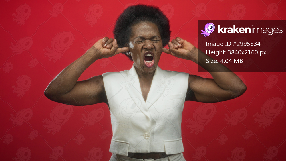 Woman plugs fingers in ears with mouth open, wearing white vest and earrings in a red studio; frustration noise protest.