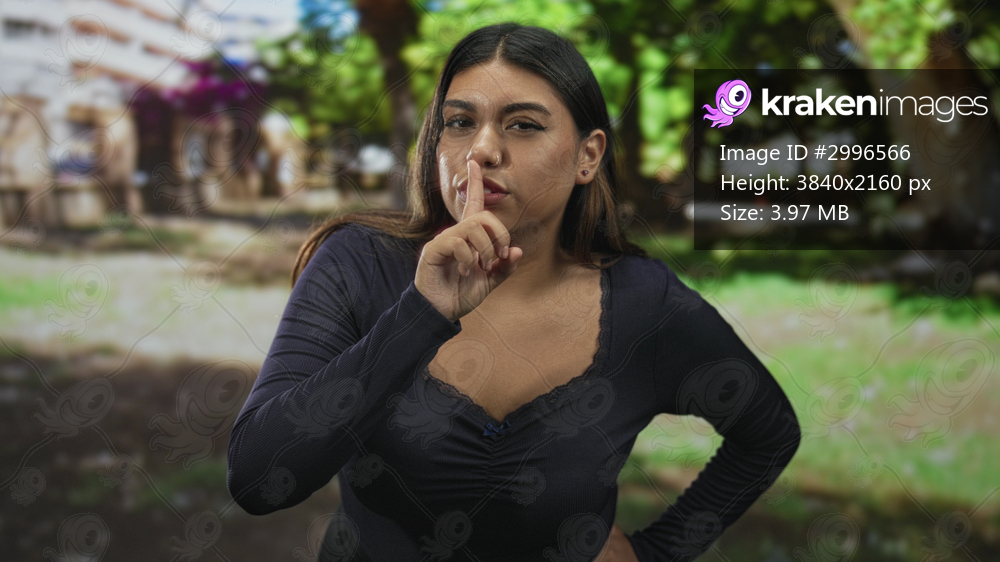 Woman plus size finger to lips gesture with nose ring and hand on hip in building setting near trees and benches; quiet confidence.