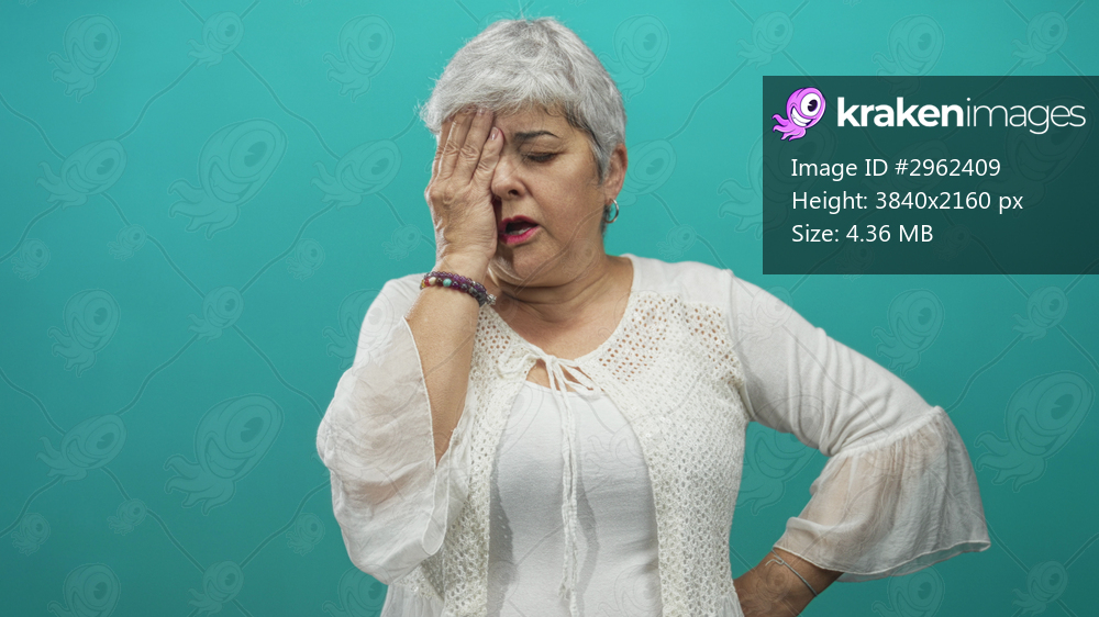 Woman plus size with grey hair pressing hand over one eye and holding other hand on hip in studio teal backdrop, white blouse and bracelets; fatigue.