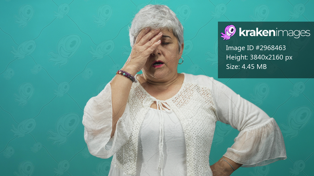 Woman plus size with grey hair pressing hand over one eye and holding other hand on hip in studio teal backdrop, white blouse and bracelets; fatigue.