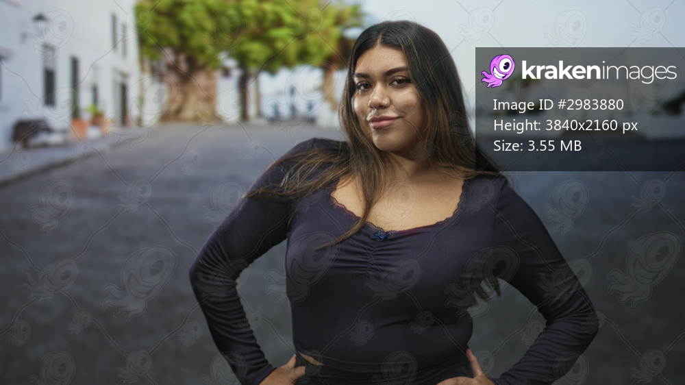 Woman plus size with hands on hips showing cleavage and a confident smile standing on a whitewashed street with trees and houses; confidence.
