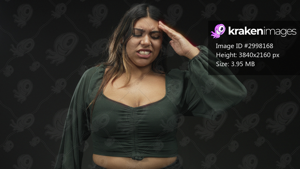 Woman plus size hispanic grimacing with hand to forehead and hands on hips, visible cleavage in green top, squinting face in studio; discomfort.