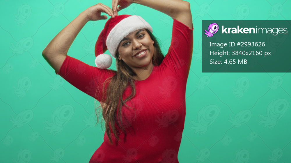 Woman plus size hispanic raises arms holding santa hat above head in studio with green backdrop wearing red dress and smiling; holiday festive playful joy. - Kraken Images