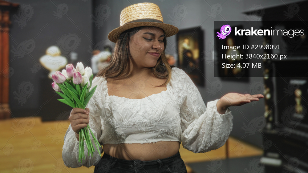 Woman plus size holds pink tulip bouquet, straw hat, palm up presenting gesture in gallery building with paintings and pedestals; playful appreciation. - Kraken Images