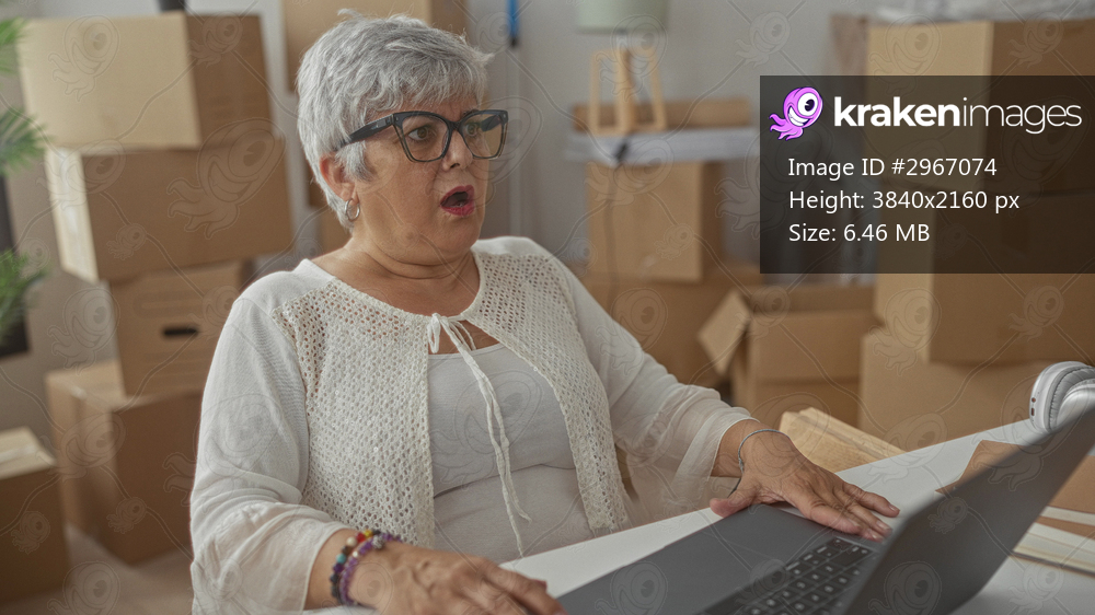 Woman plus size senior with grey hair and glasses typing on laptop with hand to forehead and open mouth in building among stacked cardboard moving boxes; moving stress. - Kraken Images