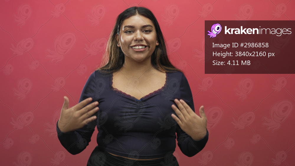 Woman plus size smiling with eyes closed, gesturing with open hands and wearing nose ring against red backdrop in studio; confidence empowerment.