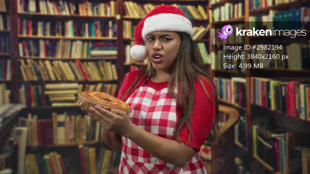 Woman plus size wearing santa hat and checked apron holding sponge cake in hands, grimacing while presenting it amid bookshelves in a building; disgust holiday cooking. - Kraken Images