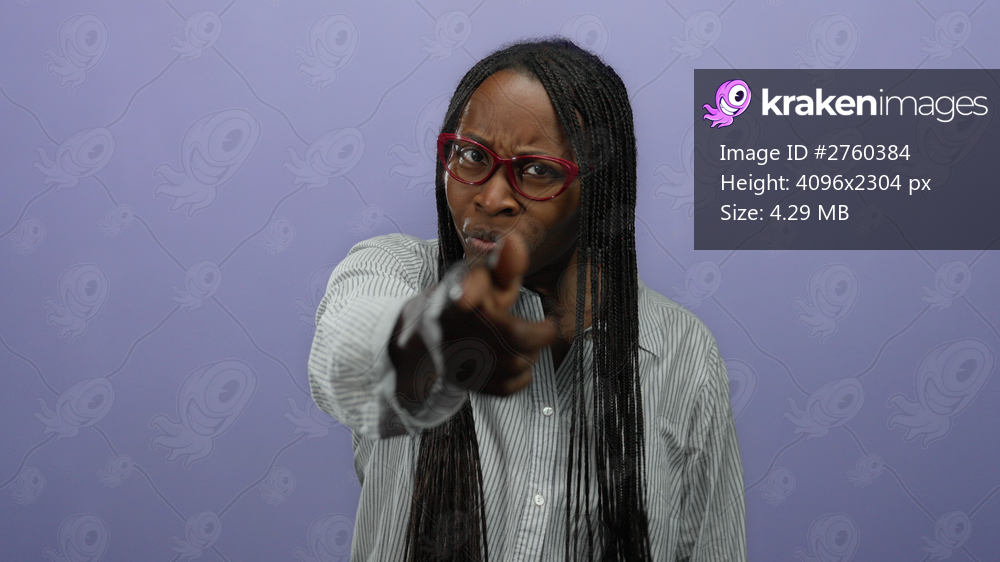 Woman pointing angrily at camera with glasses and braids against purple wall showing strong emotion vibrant expression striking pose confident attitude. - Kraken Images