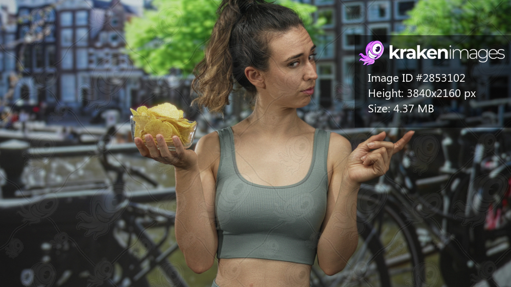 Woman pointing at a clear bowl of potato chips by a canal with a dubious look on her face; indecision choice.