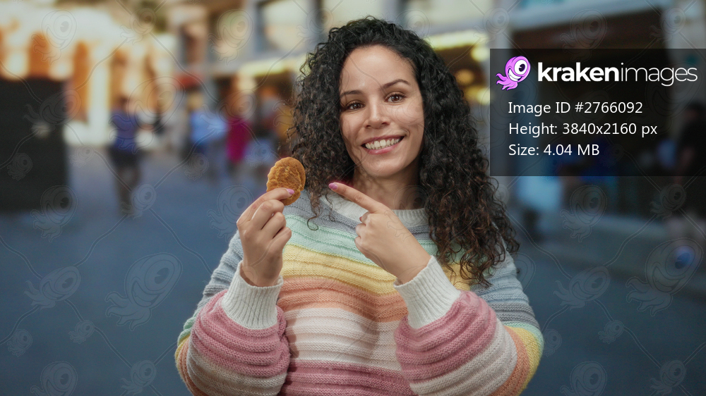 Woman pointing at a cookie on a vibrant street with a smile, showcasing happiness and joy outdoors in a colorful sweater, emphasizing a fun moment in a lively urban setting. - Kraken Images