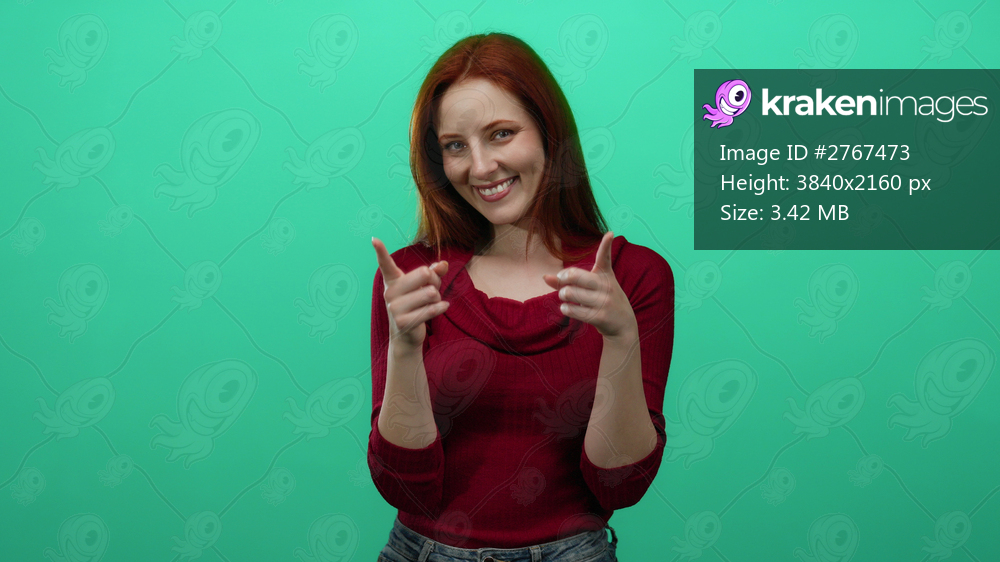 Woman pointing at camera with a cheerful smile, red hair, wearing a red sweater, against a bright green wall background.