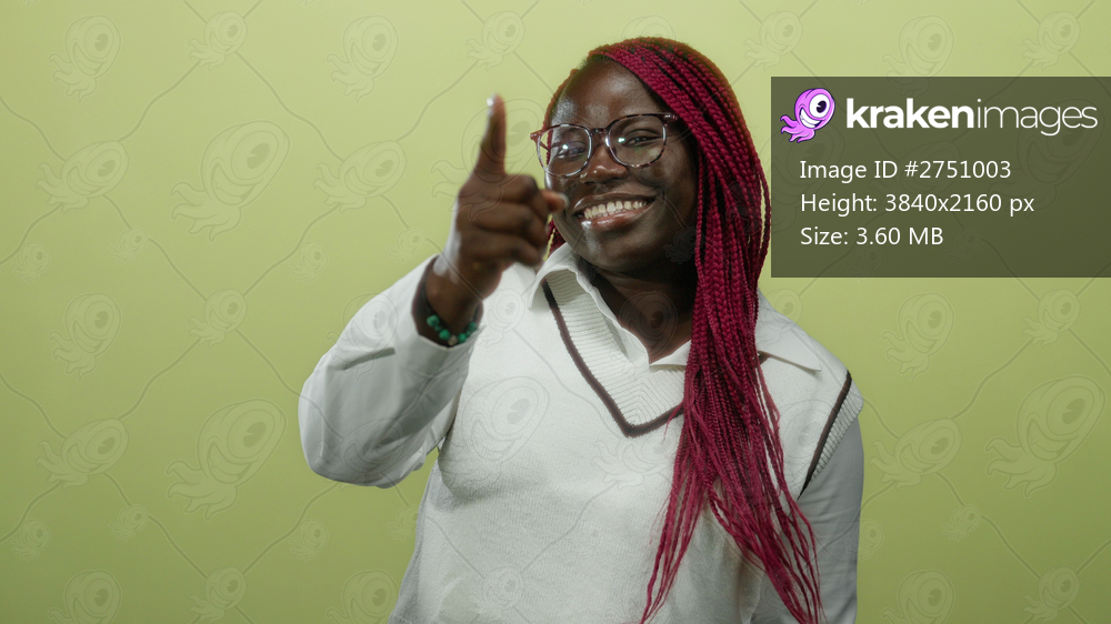 Woman pointing at camera with a joyful smile against a yellow isolated background, highlighting her braided hair, glasses, and vibrant personality.
