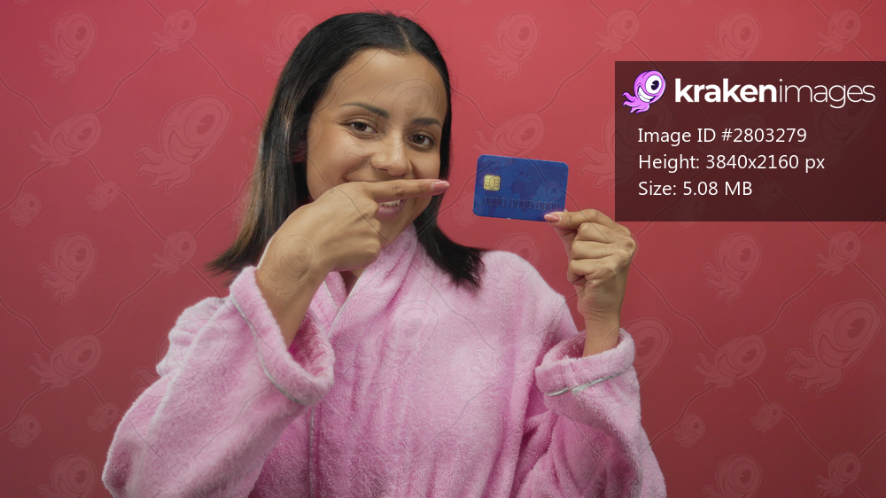 Woman pointing at credit card in pink bathrobe against vibrant red background confidently smiling, suggesting financial independence and modern lifestyle. - Kraken Images