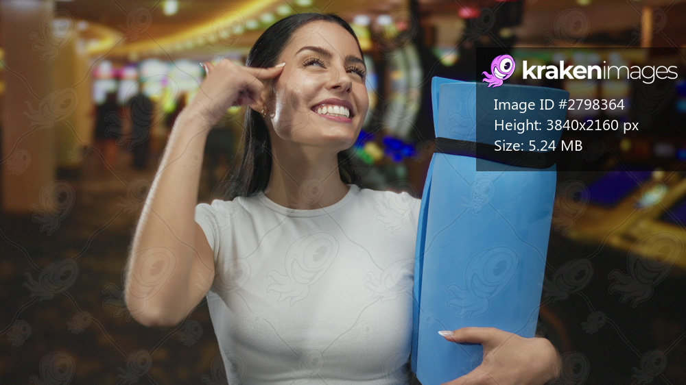 Woman pointing at head with finger while holding blue mat in busy casino with blurred slot machines in the background showing her excitement.