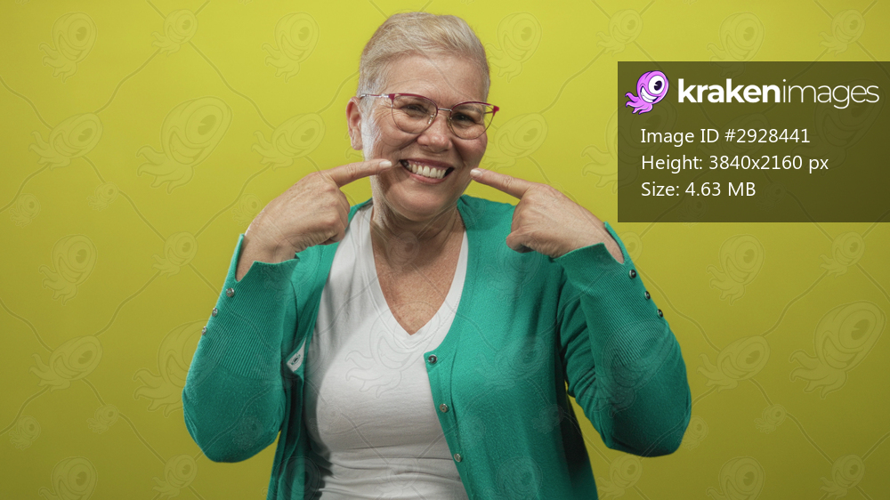 Woman pointing at her smile with both index fingers in a bright lime green studio; happiness celebration.