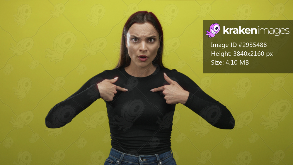 Woman pointing at herself in a bright yellow studio with a puzzled frown and accusatory hand gesture; confusion self doubt.