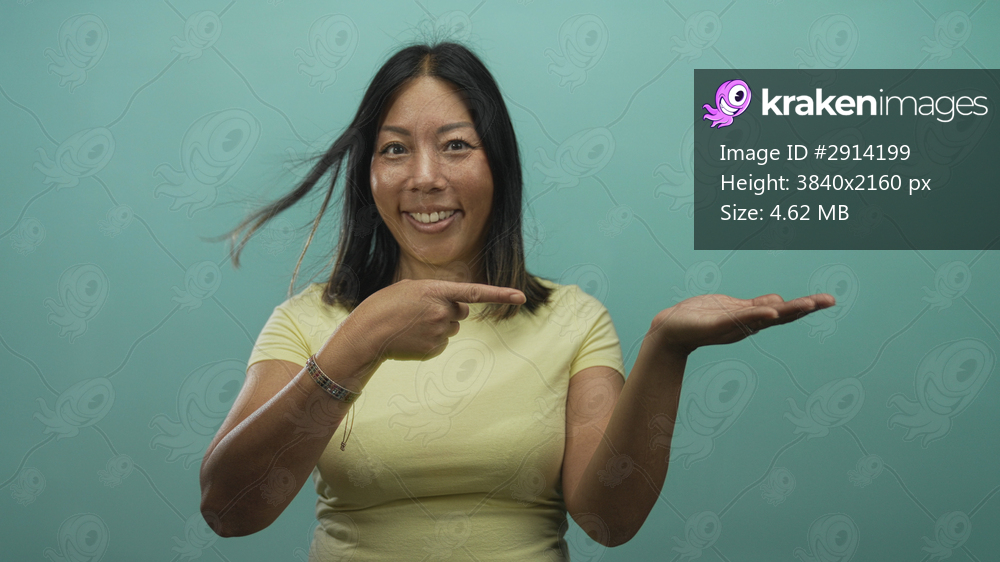 Woman pointing at open palm while presenting with both hands in studio with teal wall and wearing yellow shirt; friendly offering.
