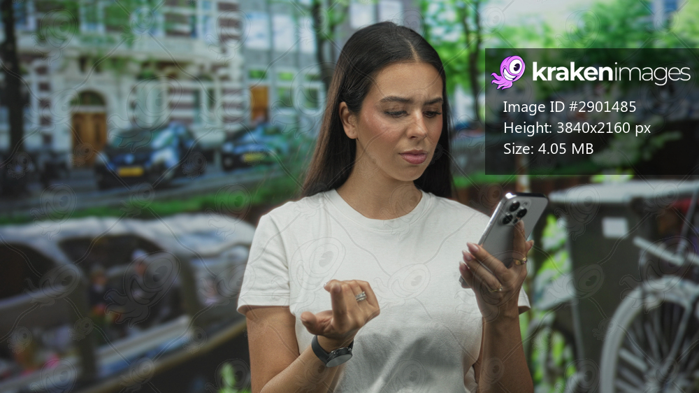 Woman pointing at smartphone with index finger on street by amsterdam canal outdoors; digital confusion.