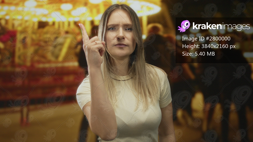 Woman pointing at the camera with a serious expression at a vibrant outdoor fair with a carousel background and festive lights at night.