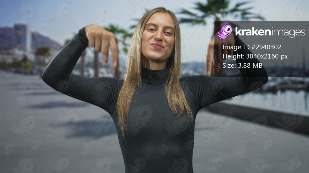 Woman pointing both fingers down at camera with exposed hands on a waterfront street; playful confidence.