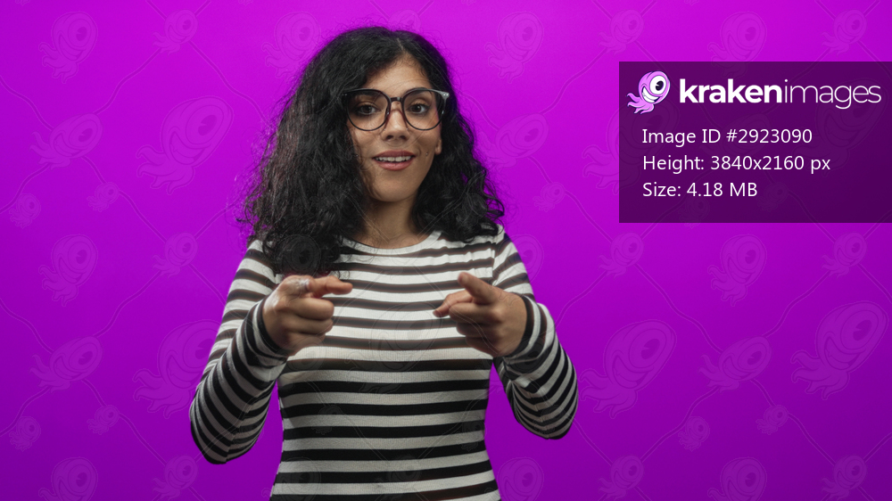 Woman pointing both fingers toward the camera in a purple studio wearing striped shirt and glasses; confidence.