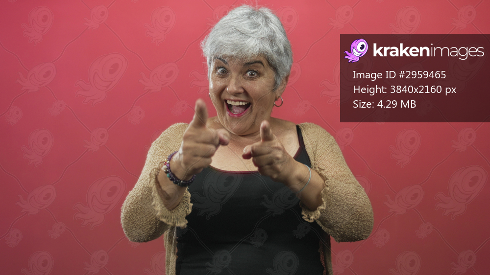 Woman pointing both hands with a smile, wearing a cardigan and black tanktop in a studio red backdrop; playful confidence.