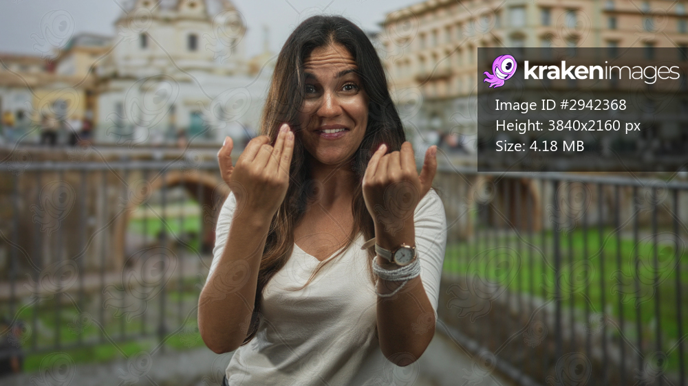 Woman pointing with both hands at camera in building ruins by ancient arches and railings; playful invitation.