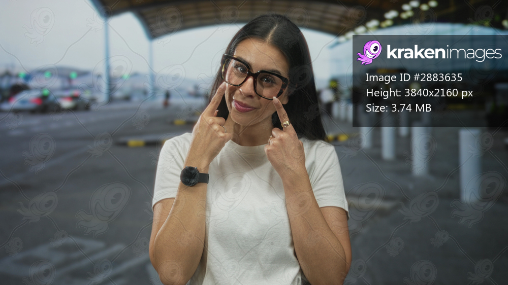 Woman pointing both hands and fingers to camera while smiling, wearing white t shirt and oversized glasses at airport terminal curbside; playful.