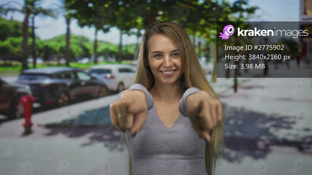 Woman pointing with both hands and smiling on a sunny city street with cars in the background surrounded by trees and people walking, creating a lively urban atmosphere. - Kraken Images