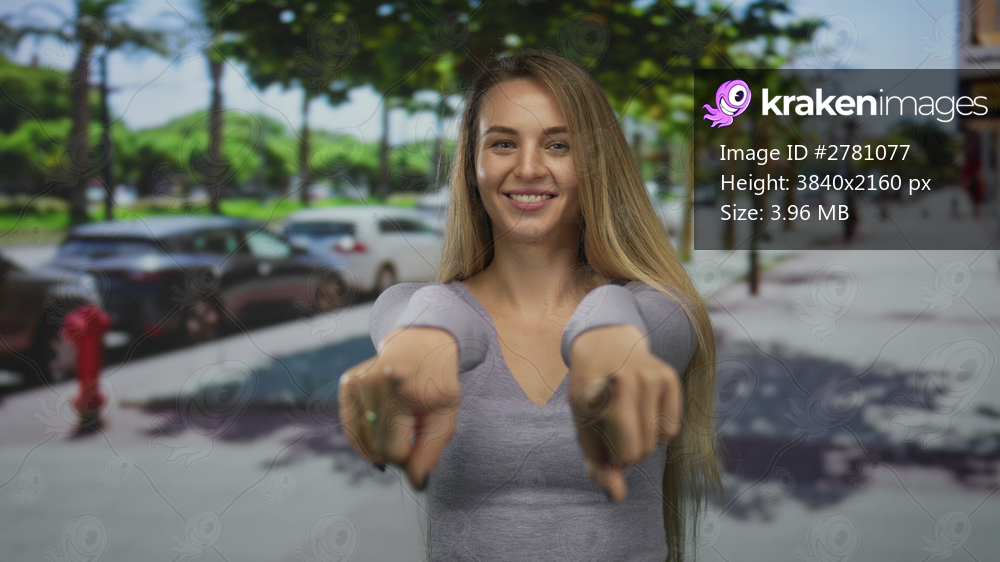 Woman pointing with both hands and smiling on a sunny city street with cars in the background surrounded by trees and people walking, creating a lively urban atmosphere. - Kraken Images