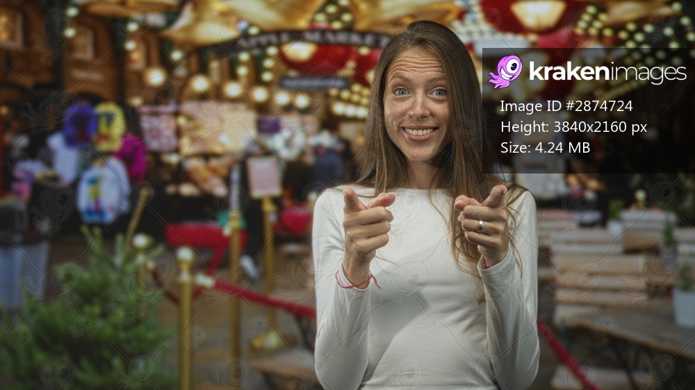 Woman pointing with both hands toward souvenir stalls in a busy street market lined with lights and crowds; cheerful greeting.