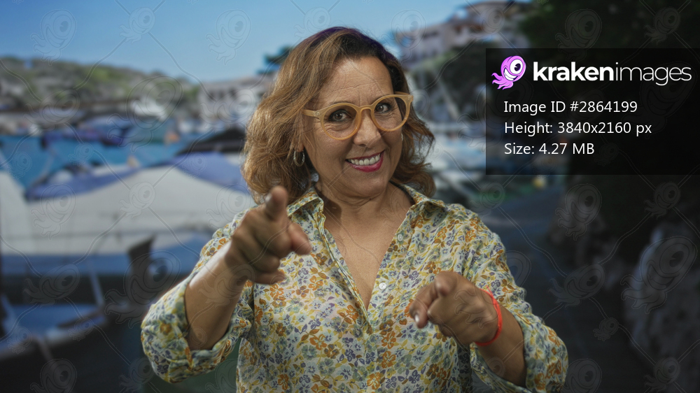 Woman pointing both index fingers at boat in outdoor port on street with a cheerful smile; confidence.