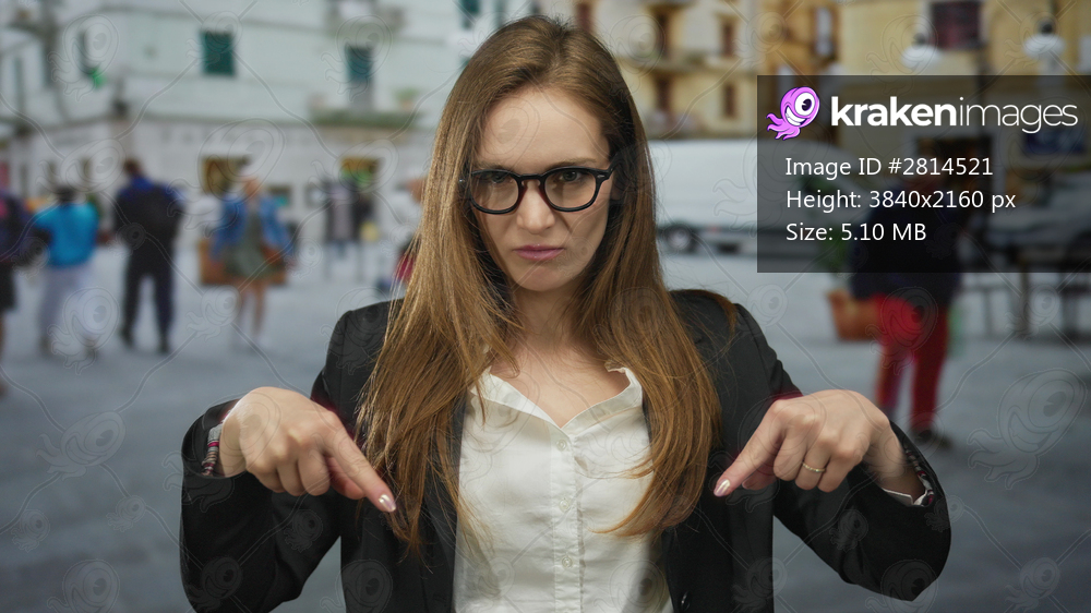 Woman pointing both index fingers down to pavement on busy city street with blurred pedestrians in background; frustration.