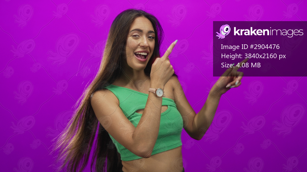 Woman pointing both index fingers to the right in studio against vivid magenta while smiling, long hair flowing, wearing a green cropped shirt and wristwatch; playful joy. - Kraken Images