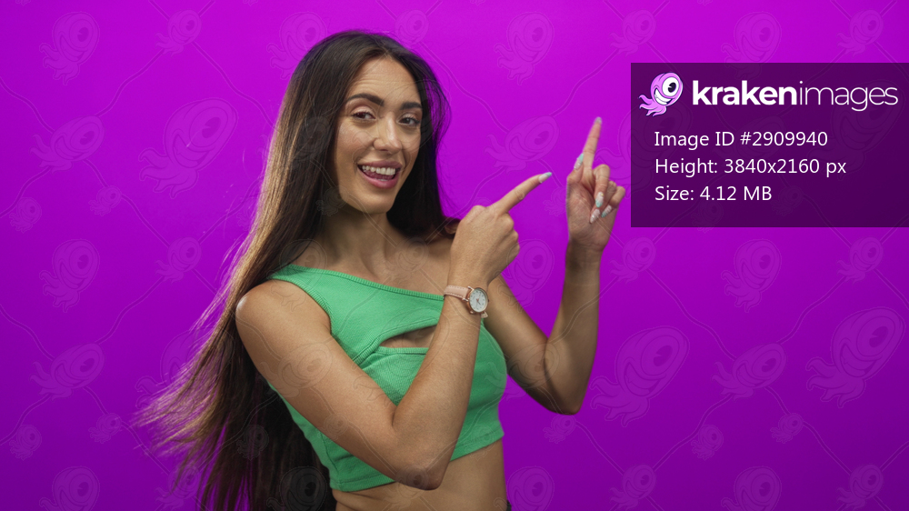 Woman pointing both index fingers to the right in studio against vivid magenta while smiling, long hair flowing, wearing a green cropped shirt and wristwatch; playful joy. - Kraken Images