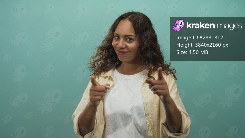 Woman pointing both index fingers toward camera in studio with teal backdrop while smiling and leaning slightly forward, showing hands and face; playful. - Kraken Images