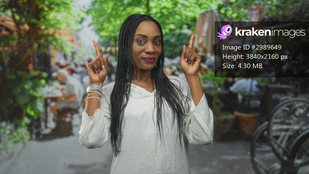Woman pointing both index fingers upward at a busy street cafe, visible fingernails, braided hair and white blouse; confidence empowerment.